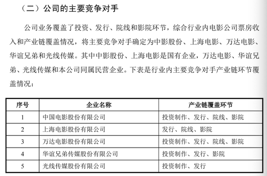 博纳影业在招股书中就列出了主要竞争对手,也是股市可以参考的对象,即中国电影、上海电影、华谊兄弟、万达电影、光线传媒。其中,覆盖投资制作、发行、院线、影院全产业链优势的公司,仅有中国电影和万达电影。