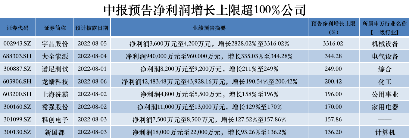 本周有8家公司预计业绩同比增长超100%,分别为宇晶股份(002943.SZ)、大全能源(688303.SH)、谱尼测试(300887.SZ)、龙蟠科技(603906.SH)、上海洗霸(603200.SH)、秀强股份(300160.SZ)、雅创电子(301099.SZ)、新国都(300130.SZ),其中宇晶股份预计上半年净利润增长最高达33倍。