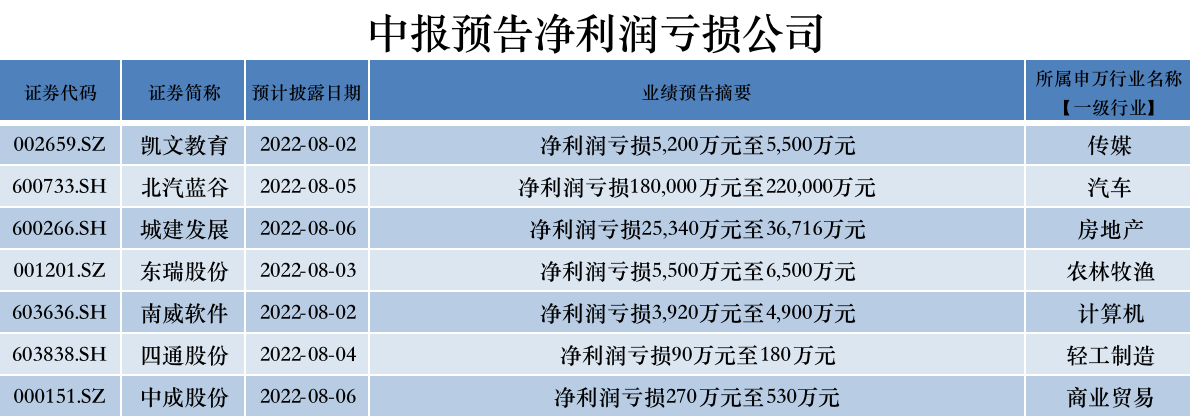此外,本周披露半年报的公司中,7家公司确定上半年业绩亏损。城建发展(600266.SH)、东瑞股份(001201.SZ)、南威软件(603636.SH)、四通股份(603838.SH)4家公司为首亏;凯文教育(002659.SZ)、北汽蓝谷(600733.SH)、中成股份(000151.SZ)3家为续亏,其中,凯文教育亏损金额较去年同期加大。