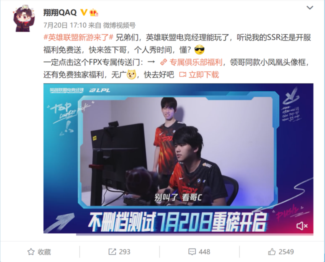7月20日,《英雄联盟电竞经理》正式上线,一众LPL知名选手都在自己的个人微博上发布了推广视频。这一系列非常具有个人标签式推广,给游戏带来了出人意料的成绩。