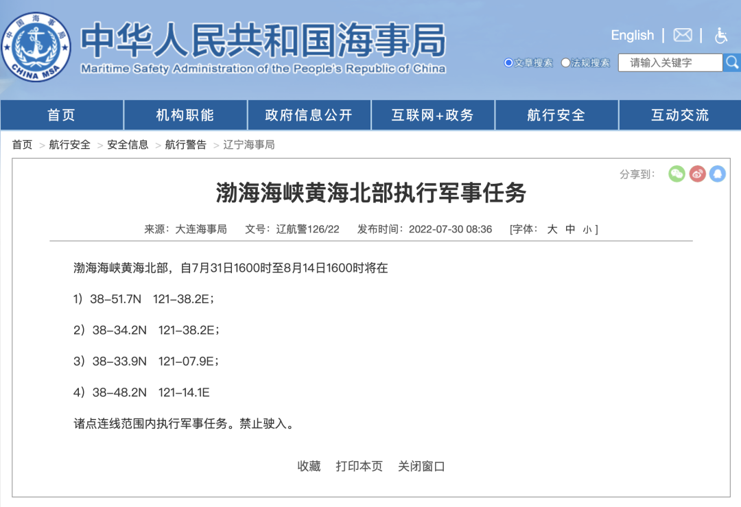 据中国海事局网站消息,大连海事局发布航行警告,自7月31日16时至8月14日16时将在渤海海峡黄海北部部分海域执行军事任务 ,禁止驶入。