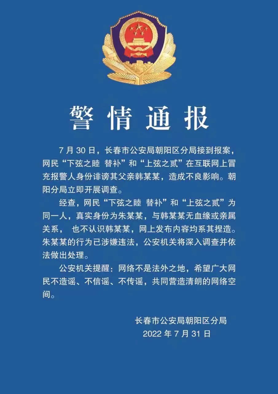 7月30日,长春市公安局朝阳区分局接到报案,网民“下弦之睦 替补”和“上弦之贰”在互联网上冒充报警人身份诽谤其父亲韩某某,造成不良影响。朝阳分局立即开展调查。