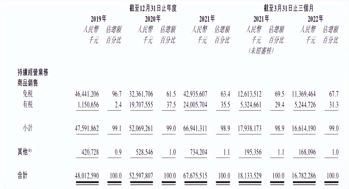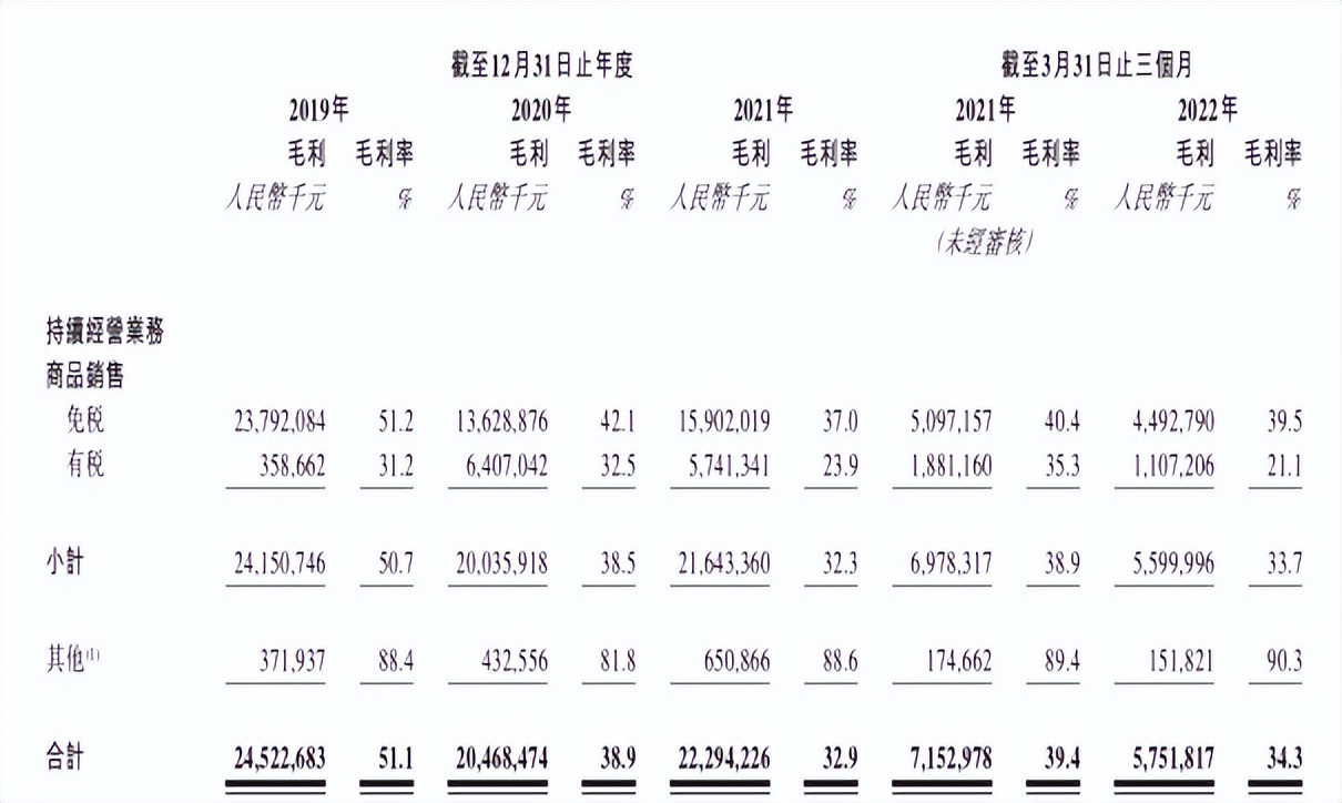 数据显示,2019年-2021年,中国中免免税商品毛利率分别为51.2%、42.1%和37%,有税商品毛利率分别为31.2%、32.5%和23.9%,有税商品与免税商品毛利率差距在10个点以上。