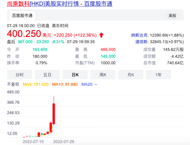 7月29日,尚乘数科股价继续飙升。截至当地时间7月29日美股收盘,尚乘数科每股涨至400.25美元,同比增长122.36%,相比于7.8美元的发行价,涨幅超5031%,总市值也来到了740.64亿美元,仅次于台积电、阿里巴巴、京东、以及中石油。