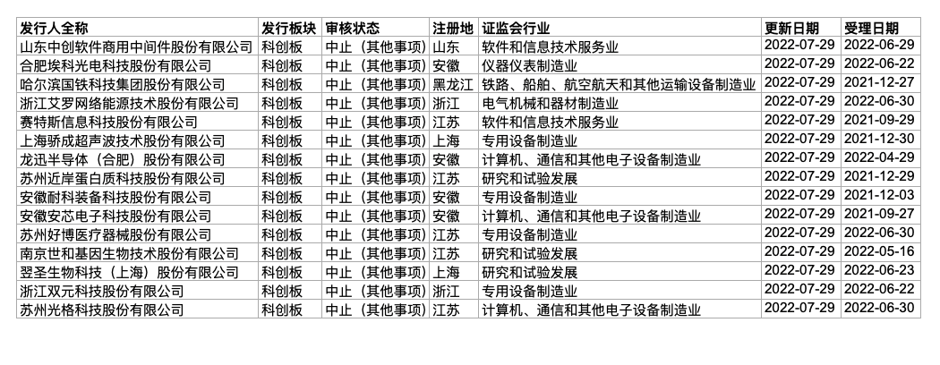 另外,15家公司计划在上交所科创板IPO。上交所表示,因发行人聘请的相关证券服务机构被证监会立案调查,根据《上交所科创板股票发行上市审核规则》第六十四条第一款第(二)项,决定中止其发行上市审核程序。