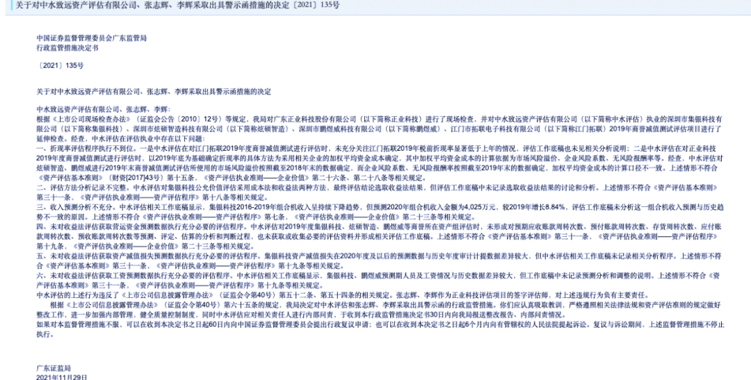 2021年11月,广东省证监局发布《关于对中水致远资产评估有限公司、张志辉、李辉采取出具警示函措施的决定》。