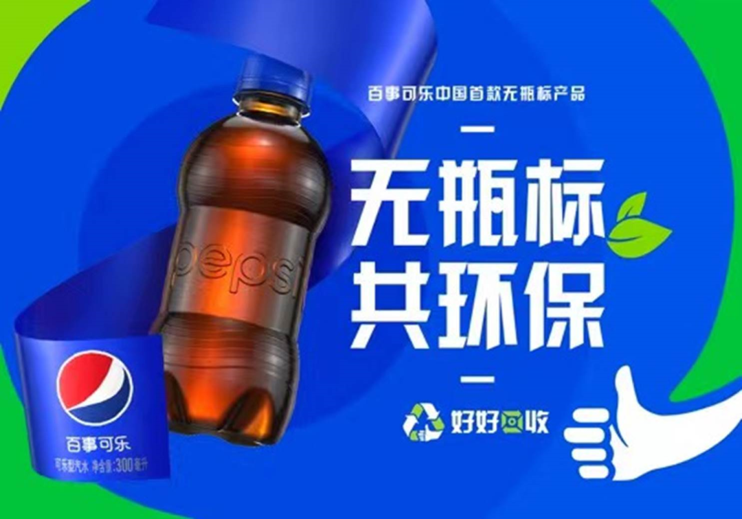 百事公司选择了消费者常见的300ml迷你瓶装原味可乐进行包装调整。“无瓶标”装百事可乐既保留了经典专利瓶身设计,又减少了瓶身塑料标签及瓶盖上的油墨印刷。商标及产品名称以浮雕工艺凸显,产品追溯和保质期信息则采用激光打印。设计上保障了商品辨识度,环保上简化回收步骤,提高回收利用率,减少材料及能源使用,减少碳足迹。 产品外层多连包包装,采用含有24%再生聚乙烯成分的材料,减少原生塑料使用,并添加“好好回收”标志。标志基于可回收符号增加点赞手势,并在“回”上围绕圆心融入两个箭头,象征被回收的饮料瓶将循环再生。去除瓶标,提供低碳商品的选择,让低碳生活成为随手小事。
