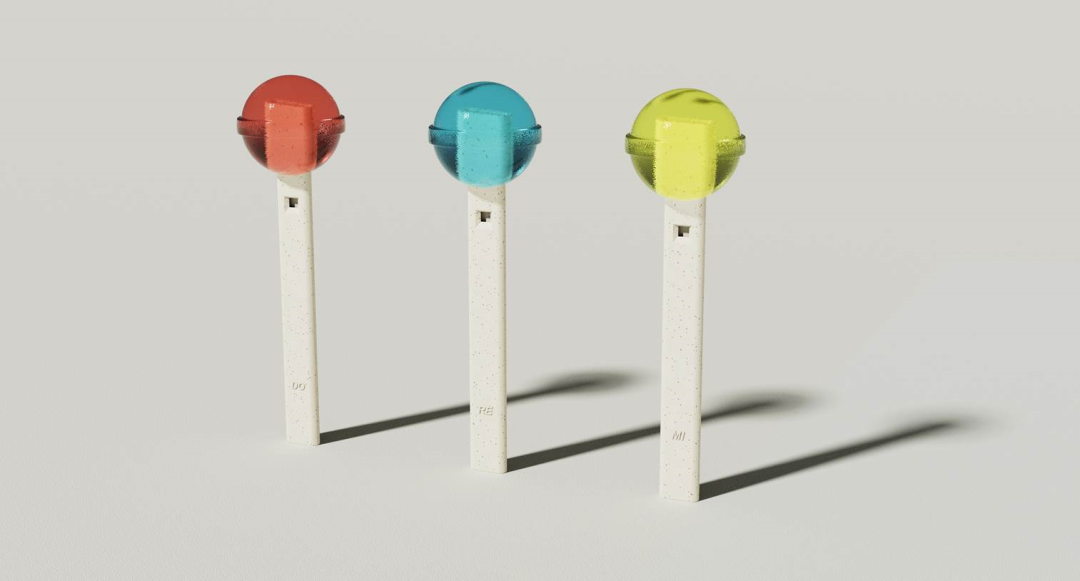 使用同款小麦秸秆材质的糖果棒签还有一款设计,灵感来源于口琴,给棒签附上音乐玩法。单个棒签可作单独的口哨,每个口哨音律不同,而所有糖果食用完后,这些棒签组合到一起,摇身一变成了一只小口琴,音符多多,乐趣多多。该系列糖果棒签不仅在源头材料使用更环保的小麦秸秆,还增加了棒签的多种可玩性,减少棒签丢弃。