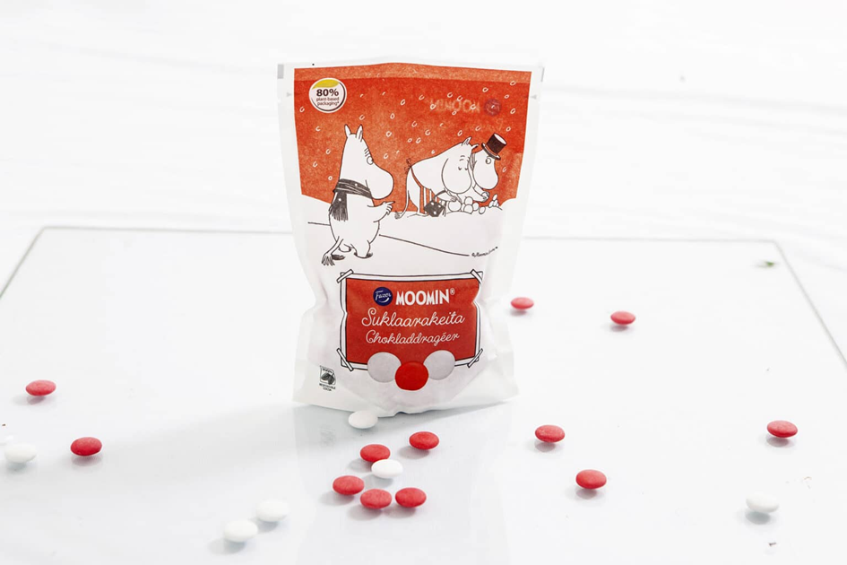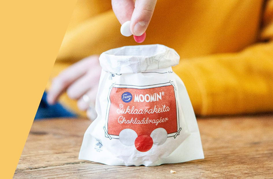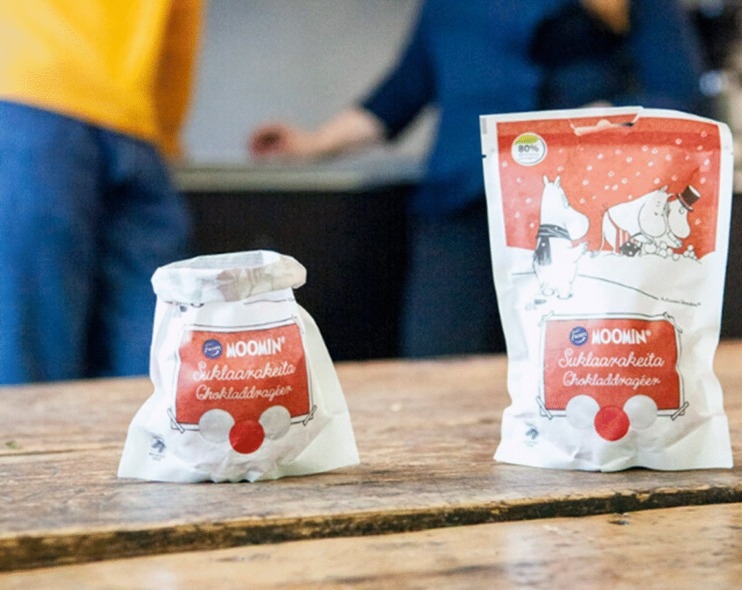 同样来自芬兰的Paptic公司开发了一种基于木纤维的可再生、可再利用和可回收的材料。Paptic 是一种单一材料,不含塑料,没有任何塑料涂层或衬里层,它主要由木纤维组成,并且通常在回收过程中作为纸张分类来进行分解,但它比纸更轻、更耐用,甚至可以拉伸。目前Paptic 已完成和Moomin姆明卡通形象品牌的合作,代替塑料包装,应用于干燥食品包装,助力食品包装可持续。