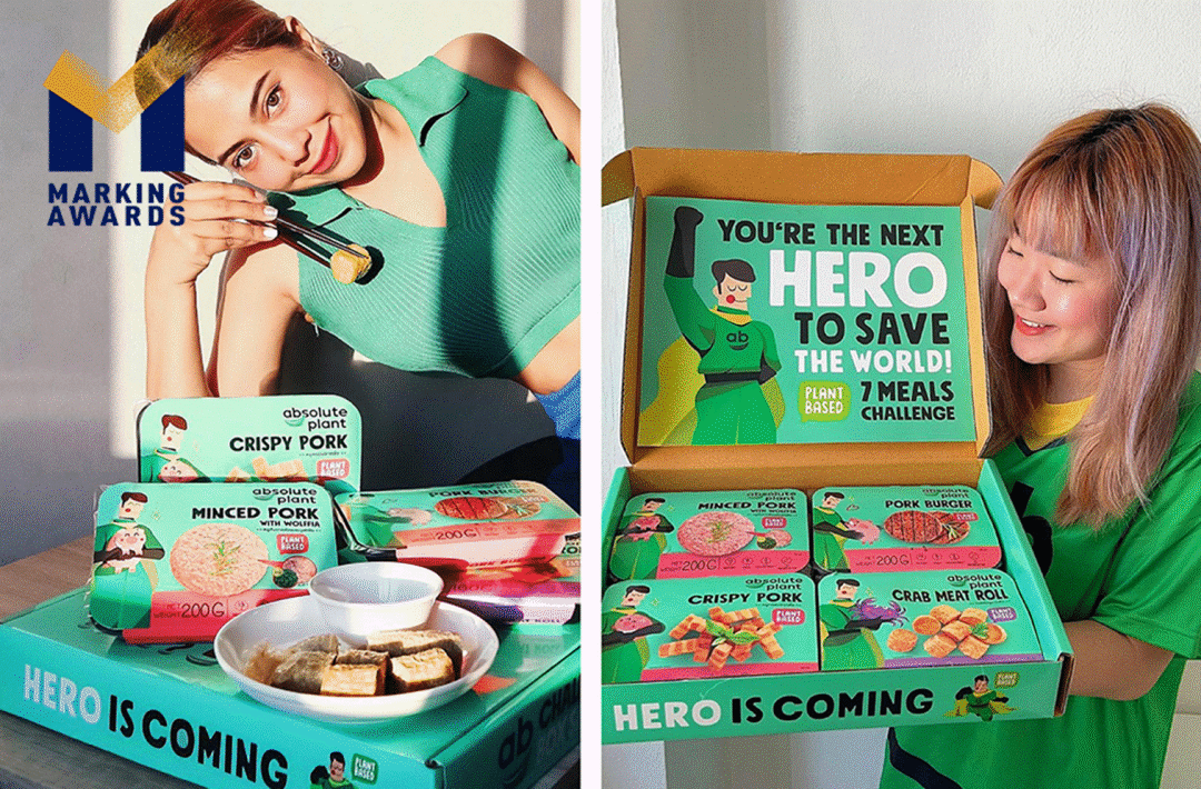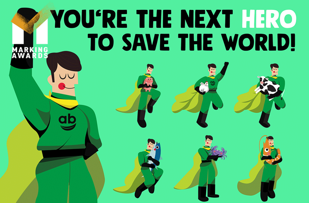 身着叶子制成的长袍和绿色战服, "Mr.AB" ——一位活泼友好的新英雄跃然纸上。他怀抱小动物,说服你将菜单中的肉制品改为Absolute Plant的素食制品,既拯救动物的生命,又帮助减少全球二氧化碳排放。“你,就是下一个拯救世界的英雄!”,简短有力的口号和形象生动的插画英雄,暗示购买AbsolutePlant产品的消费者已经积极参与到这场“绿色”行动中了,更积极地引导食品减碳消费。