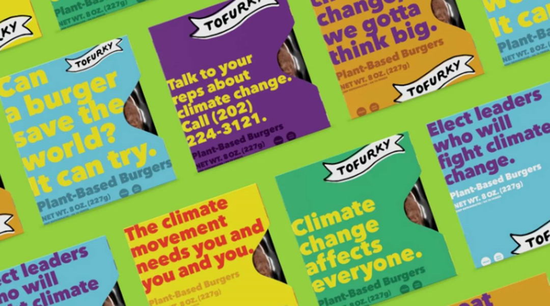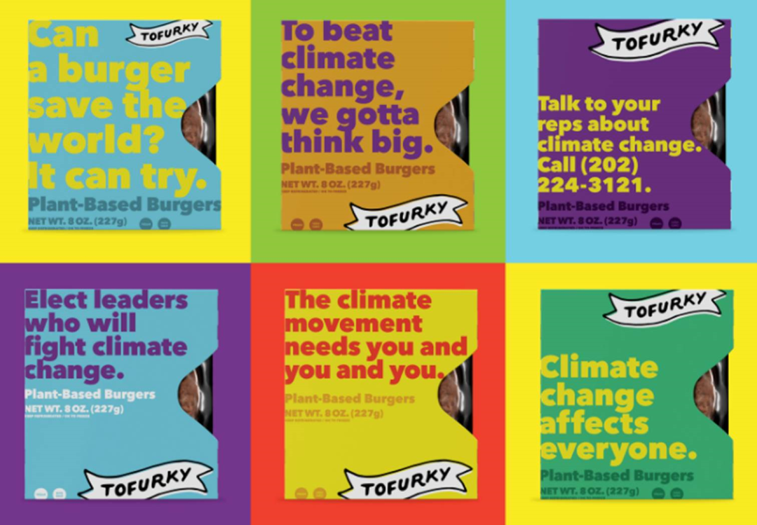 密歇根大学进行的一项研究发现,以植物为基础的肉饼相比传统肉质肉所产生的温室气体排放减少了90%,生产所需的能源减少了46%,对水源短缺的影响减少了99%,对土地使用的影响减少了93%[5]。Tofurky一直专注于创造美味且价格合理的素食替代肉类,为了激励消费者更多选择减少温室气体排放的植物肉,Tofurky推出全新包装,将应对气候变化的呼吁置于包装首位。其中包含六条口号以及消费者可以采取的行动,例如“气候变化影响所有人”,醒目的标语使得Tofurky在超市的货架上成为支持对抗气候变化的广告牌。
