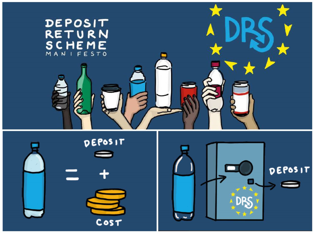 DRS押金返还系统.,指的是在购买饮料瓶装产品的消费者支付额外押金,在将塑料瓶包装或产品退回到收集点时予以补偿。图片来源:Zero Waste Europe