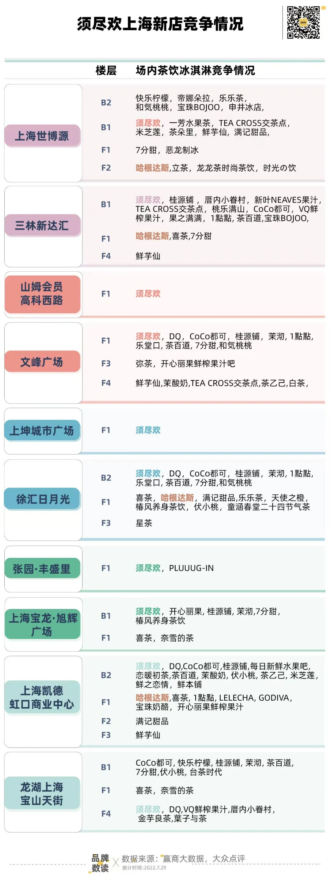 在同层中,抛开上坤城市广场和山姆会员高科西路两家店,三林新达汇(CoCo都可、1點點、桂源铺)、文峰广场(CoCo都可、1點點、桂源铺)、徐汇日月光广场(CoCo都可、1點點、桂源铺)、上海宝龙·旭辉广场(桂源铺)、上海凯德虹口商业中心(CoCo都可、桂源铺)几家购物中心里中端价格带的品牌扎堆,CoCo都可、桂源铺和一点点频繁与须尽欢碰面。