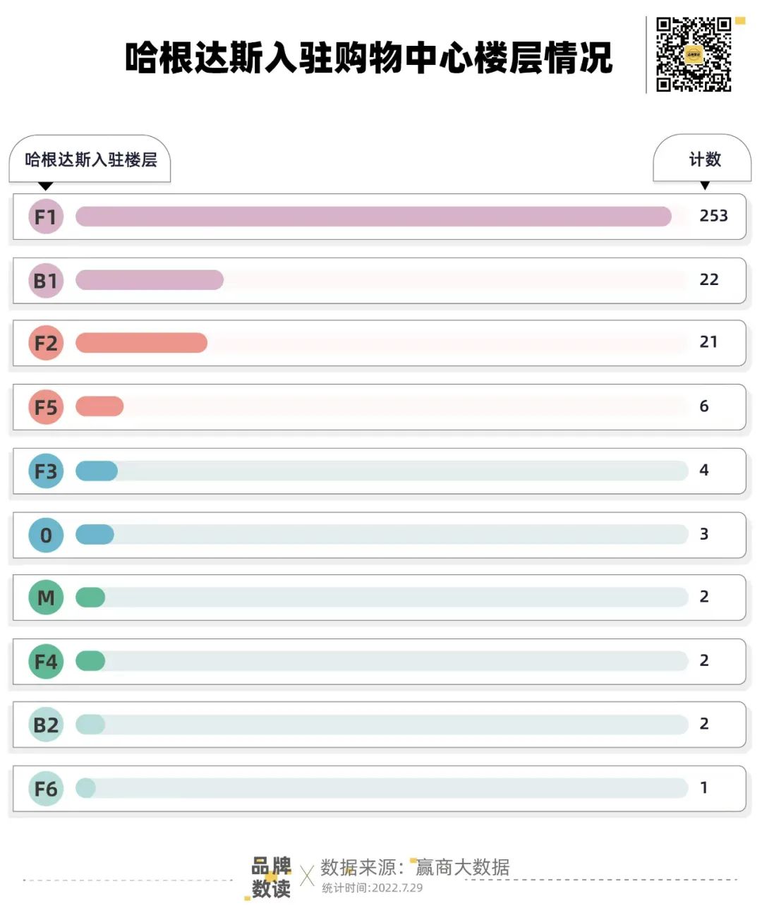 在购物中心的品牌逻辑中,1楼是品牌们争相进驻的楼层,它某种程度上代表了品牌的“身价”。而1层一直是哈根达斯的首选。根据赢商大数据,在哈根达斯310家购物中心中,253家位于1层,占比达80%。