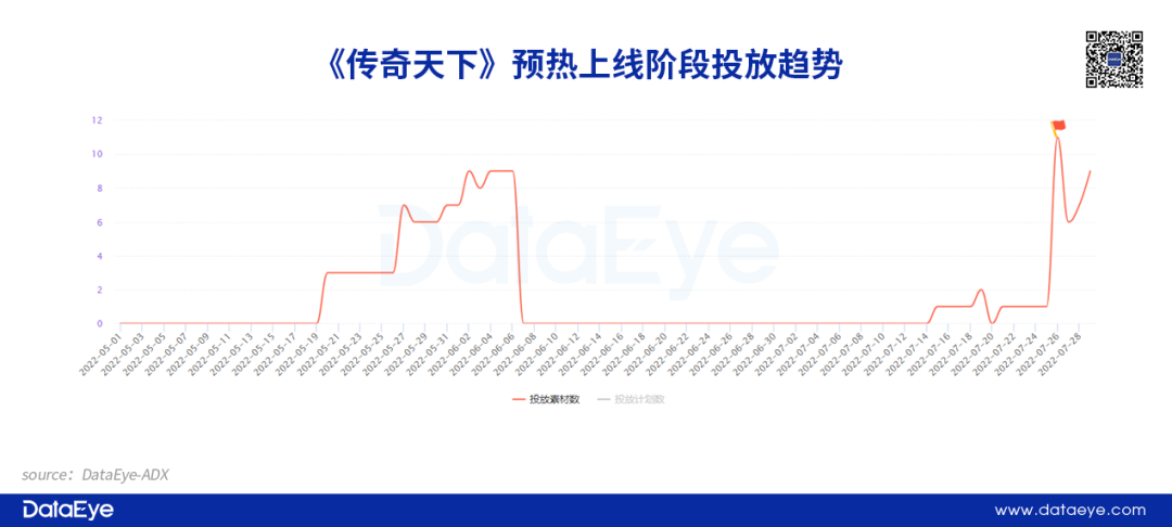 《传奇天下》在产品初期阶段,采用了较为不同的投放策略。根据DataEye-ADX投放数据显示,《传奇天下》产品预热测试、上线阶段素材投放量偏少,单日投放峰值不高,而且后续几天也没有做大规模投放。
