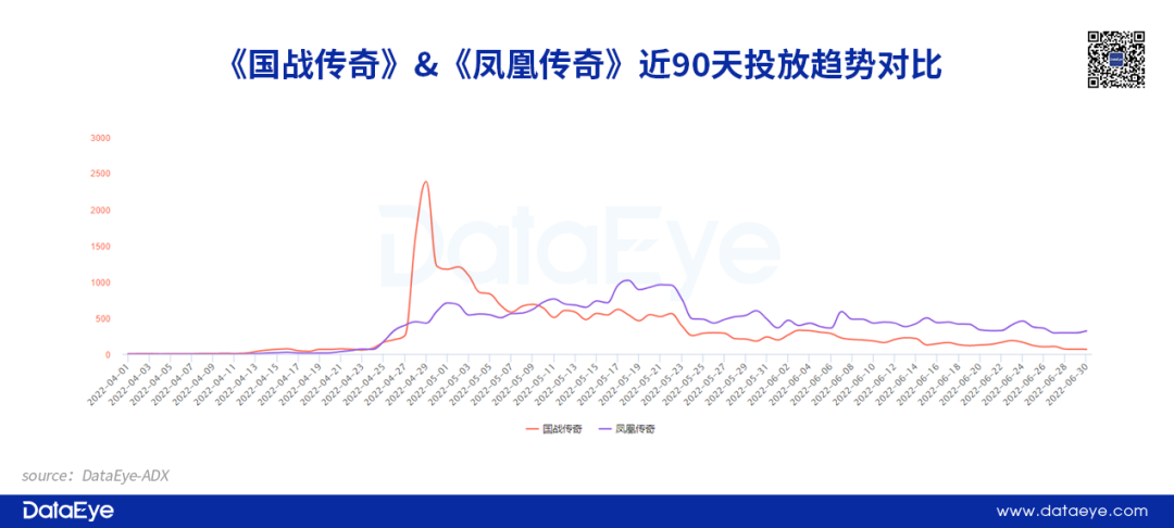 对比之下,贪玩上半年上线的两款传奇类产品,则采用相对传统的买量打法。根据DataEye-ADX数据显示,这两款产品侧重在产品上线爆发阶段加大素材投放,如《国战传奇》上线后单日投放素材突破2500余组,而《凤凰传奇》则日均稳定在1000余组投放量,随后二者素材减少,但并未完全放弃投入。