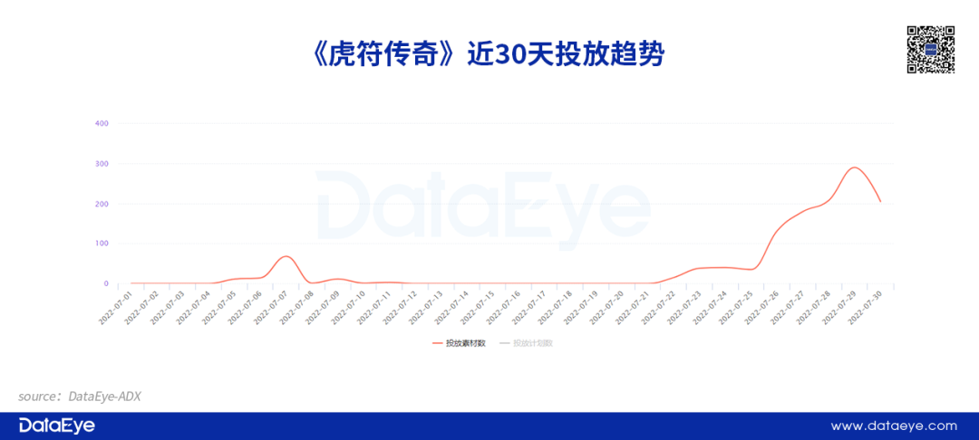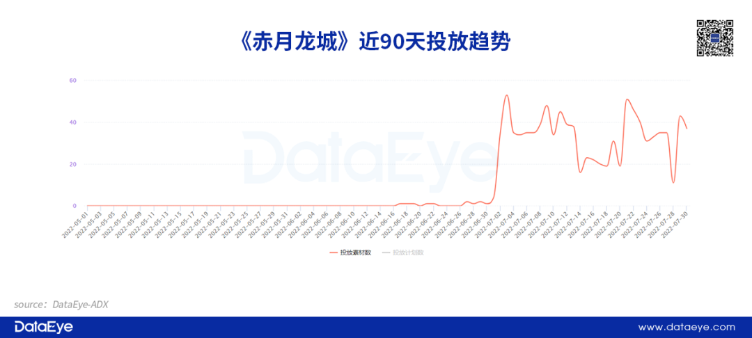其二,买量思路逐渐转变。传奇产品的创意素材同质化严重,核心用户逐渐产生视觉疲劳,转化率逐渐不乐观,以至于不少厂商转变推广思路。目前仍在畅销榜TOP200的另外两款传奇产品《虎符传奇》、《赤月龙城》亦是如此。根据DataEye-ADX数据显示,前者上线后加大投放,峰值不超过300余组;后者日均投放量在40余组左右。