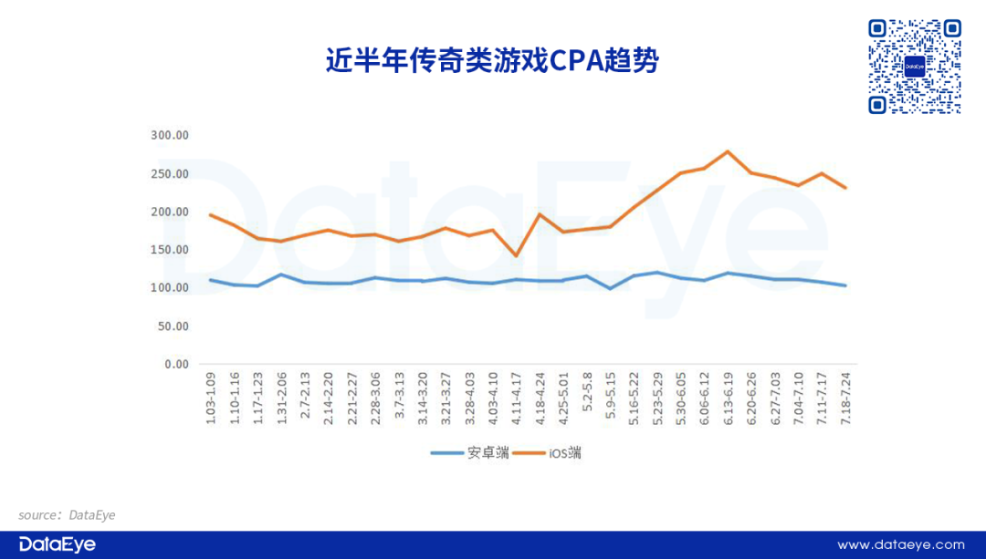其一,传奇品类CPA持续走高。根据DataEye研究院品类CPA测算数据显示,今年以来传奇CPA持续高位横盘,6月中旬突然走高,iOS端一度接近300/A。对于传奇厂商来说,持续上涨的投放成本形成了无形的压力。