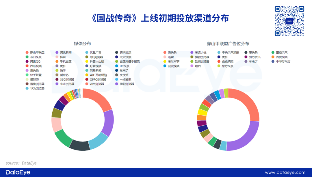 DataEye研究院认为,《国战传奇》营销打法较为传统,期望在产品初期则通过大范围投放方式,以覆盖更多目标用户群体。而《传奇天下》在从投放素材素以及投放渠道节省了大量的营销预算。