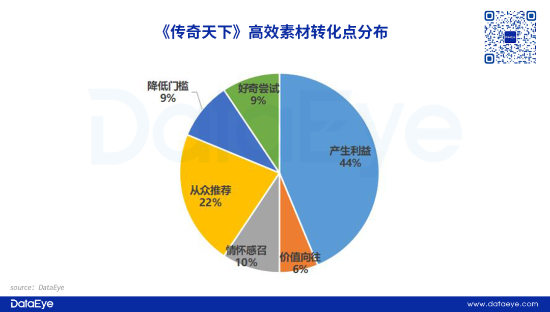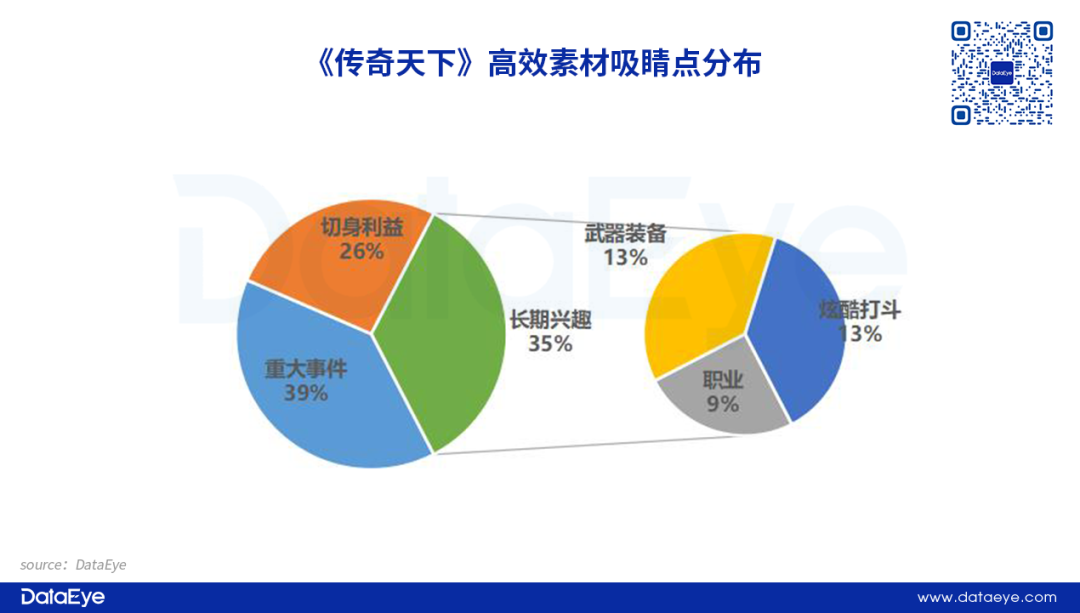 从吸睛点来看,《传奇天下》高效创意素材重点以“重大事件”作为切入点,突出画面升级、突破创新的传奇游戏上线制造话题点。项目组还会展示“武器装备”、“炫酷打斗”以及“职业”等传奇品类常见的吸睛点。