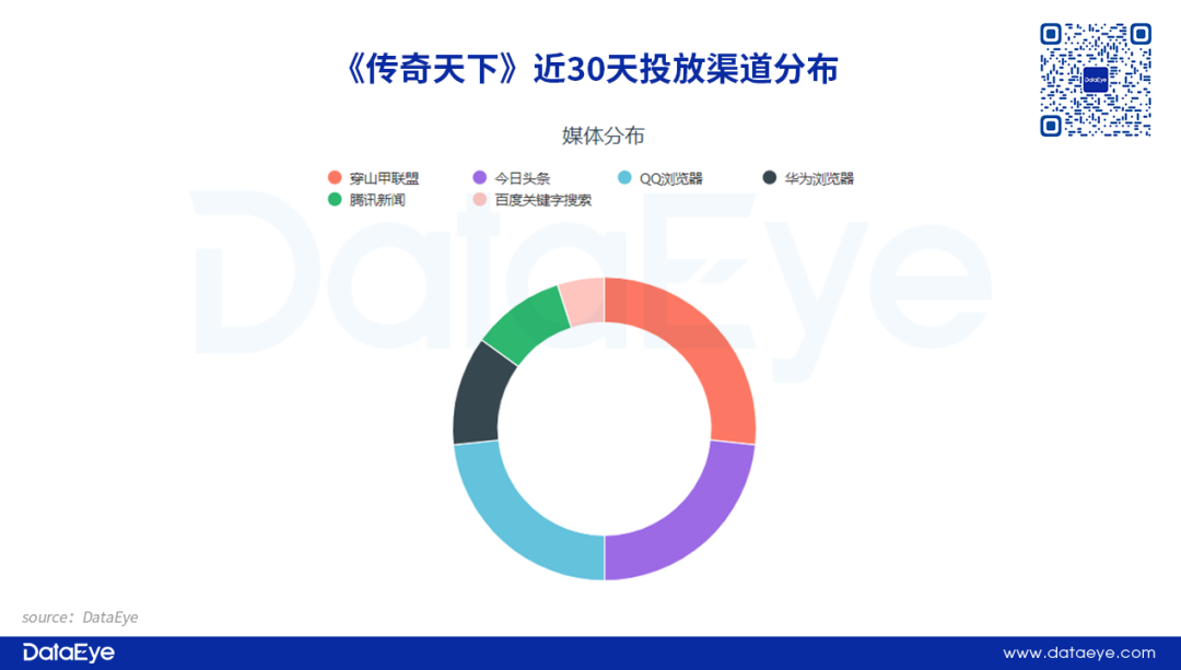 根据DataEye-ADX数据,《传奇天下》以字节系投放渠道为主,穿山甲联盟与今日头条共计占比接近50%,但从投放渠道数量来看,项目组仅仅在6个渠道上进行素材投放,并全部为图文媒体渠道。