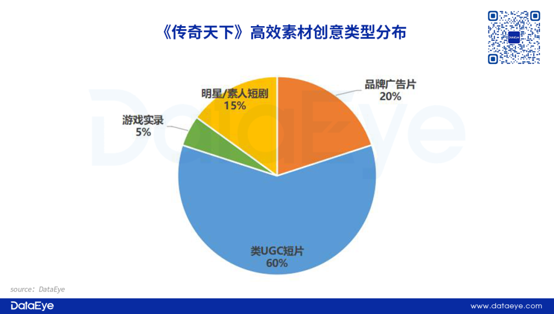 《传奇天下》高效创意素材中加入不少品牌广告片,并且时长均超过1分钟。项目组希望在有限的买量素材上,建立品牌调性。
