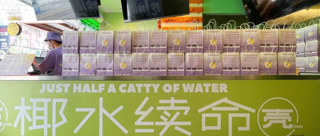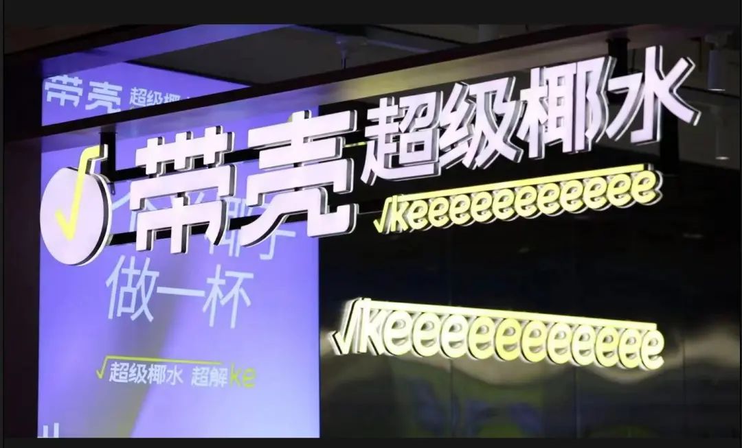 此外,壳的中文拼音为ke,与渴的中文拼音相似,因此在门店设计时,“ke”也有了更多延伸。比如品牌slogan“超级椰水、超解ke”,购物袋上也有√keeeeeee的标志。