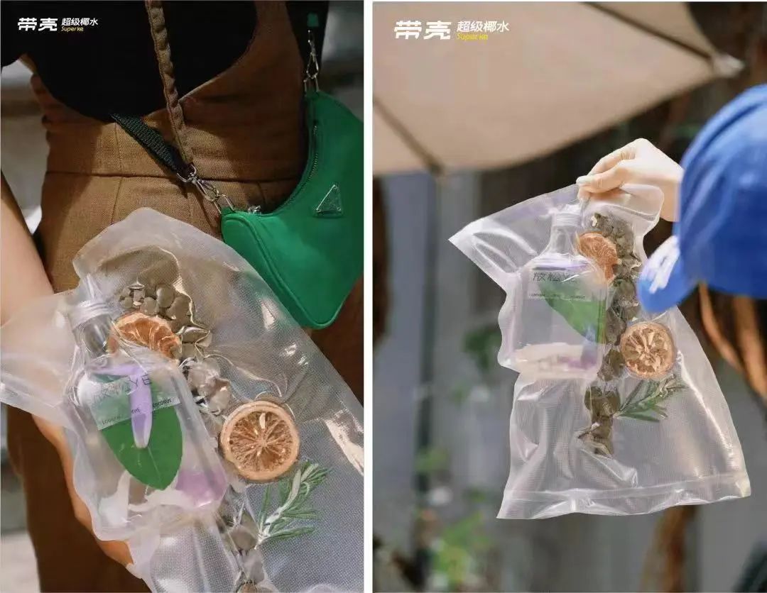 带壳也一样,比如爆款产品“傍晚电椰水”,就是通过真空包装+干花干果装饰这一不常见的饮品配置,让消费者更愿意分享出来。