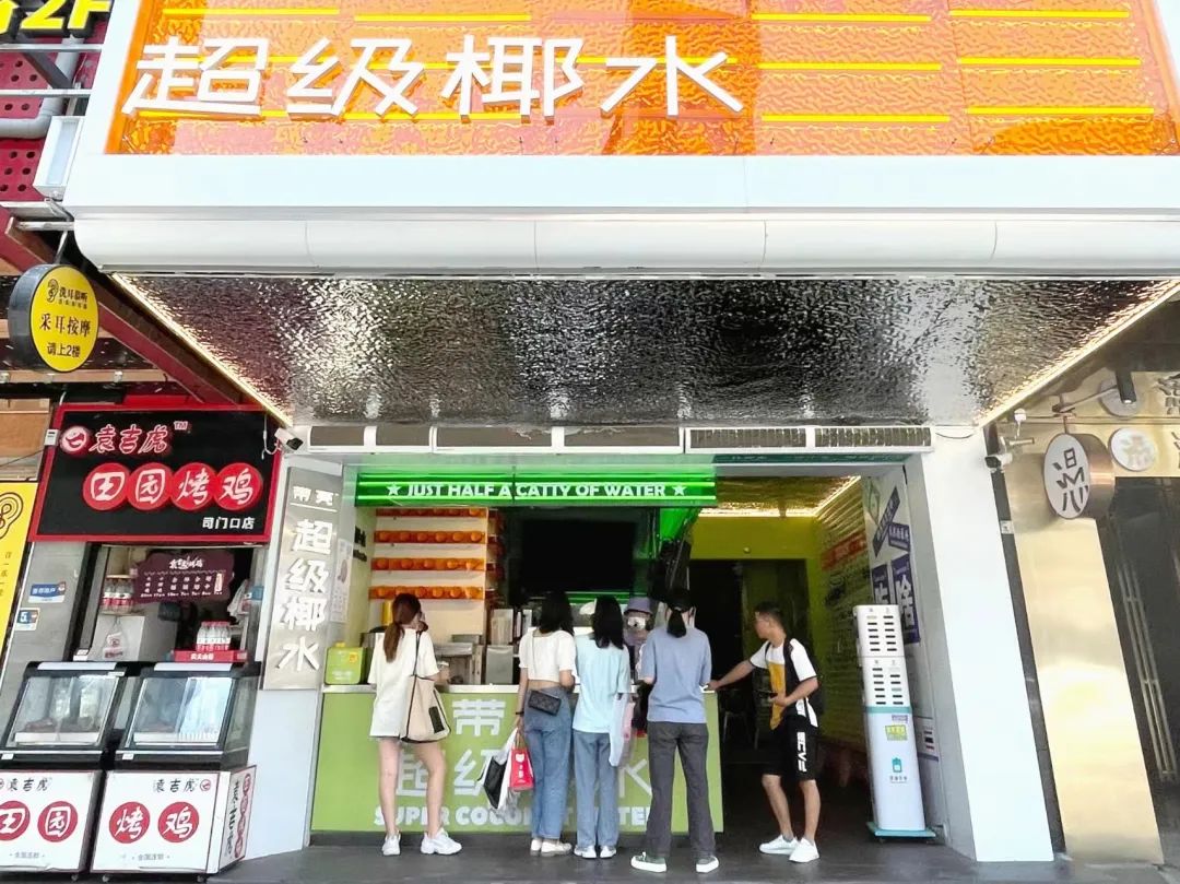 高饱和的黄绿门头,椰子壳做成的装饰墙,还有清晰可见的“超级椰水”、“椰水续命”等标语,即使在遍地网红的长沙解放西路,也很吸睛。