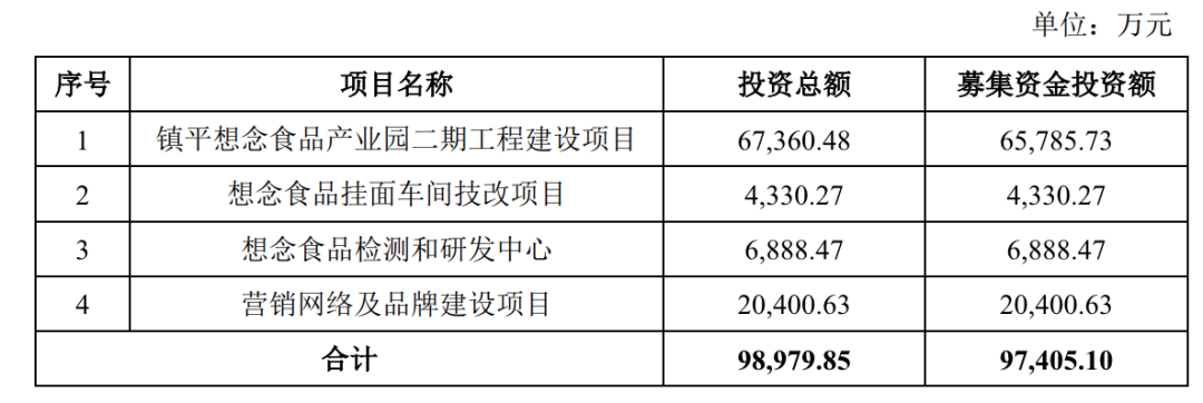 本次IPO,想念食品拟发行不超过3600万股,募集资金计划用于镇平想念食品产业园二期工程建设、想念食品挂面车间技改、食品检测和研发中心、营销网络及品牌建设。