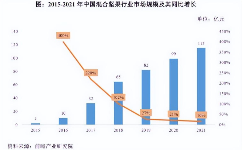 根据前瞻产业研究院的预测,每日坚果行业的市场空间良好,2022-2027年我国混合坚果行业市场规模年均复合增速将达到18%,预计到2027年我国混合坚果行业市场规模将达到310亿元。