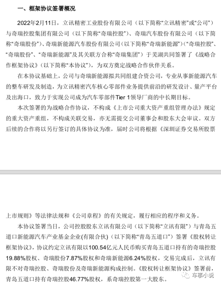 据立讯精密发布公告称,当日,公司控股股东立讯有限与青岛五道口签署《股权转让框架协议》,协议约定立讯有限以100.54亿元购买青岛五道口持有的奇瑞控股19.98%股权、奇瑞股份7.87%股权和奇瑞新能源6.24%股权。交易完成后,青岛五道口持有的奇瑞股份从46.77%减少至26.89%,降为第二大股东,立讯精密则为第四股东。