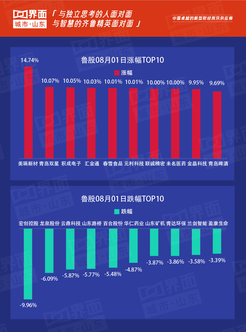8月1日,山东省内沪深京股票有121只个股上涨,141只个股下跌;总市值过千亿的有万华化学(600309)、海尔智家(600690)、兖矿能源(600188)、青岛啤酒(600600)、中航沈飞(600760)、歌尔股份(002241)、潍柴动力(000338)共7家,500亿-1000亿的共有5家,分别是山东黄金(600547)、华熙生物(688363)、联泓新科(003022)、华鲁恒升(600426)、中泰证券(600918)。