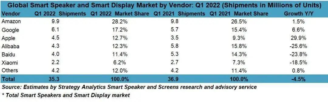 ▲2022年第一季度全球智能音箱市场份额排名(图源:Strategy Analytics)