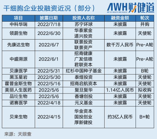 据天眼查数据显示,有中金资本加持的华龛生物今年3月即完成3亿元B轮融资,截至7月另有22家干细胞公司,如霍德生物、贝康医学等完成融资或并购,在医疗股一度低迷之下,干细胞赛道异常火热。