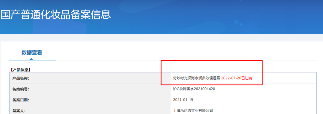 C2CC传媒x新妆资讯通过国产普通化妆品备案信息平台查询发现,被查产品——奇妙时光深海水润多效保湿霜已经在2022年7月20日被注销。备案信息显示,上海乐达通实业有限公司为该产品备案人。