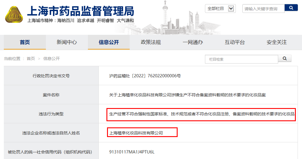 处罚决定书显示,2022年1月5 日,上海市药监局对上海植幸化妆品科技有限公司进行监督检查,经查,奇妙时光深海水润多效保湿霜为国产普通化妆品,产品备案编号:沪G妆网备字2021001420,上海植幸化妆品科技有限公司是该产品的实际生产企业。产品备案凭证载明的成分不含海藻糖。