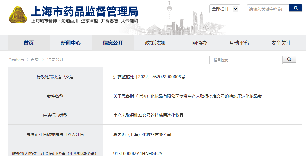 今年7月5日,上海市药监局公布了一则关于恩客斯(上海)化妆品有限公司涉嫌生产未取得批准文号的特殊用途化妆品案。