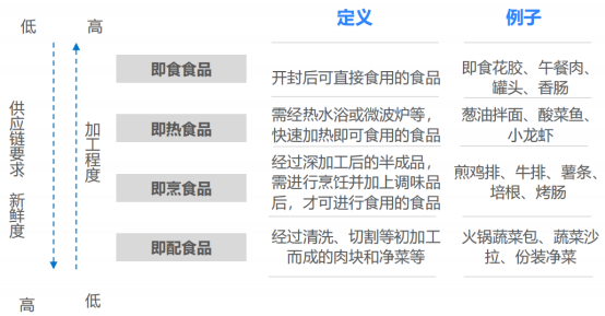 ①即食预制菜:开袋即食,如罐头、午餐肉、八宝粥