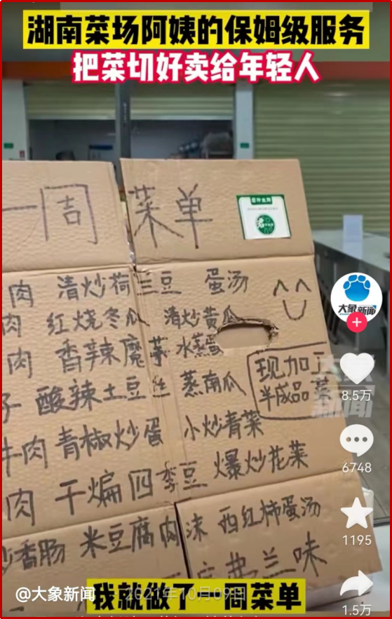 之前抖音上有一个案例,长沙菜场的李阿姨,在自己的摊位上为年轻人推出了一周菜单,并为他们洗好切好按份包装,甚至附赠烹饪技巧。