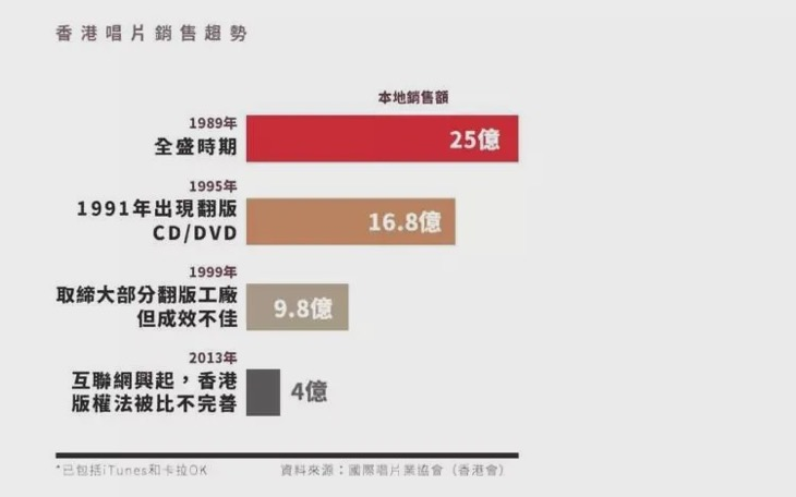 据资料显示,从95年到98年,三年时间,香港唱片零售值减少一半。