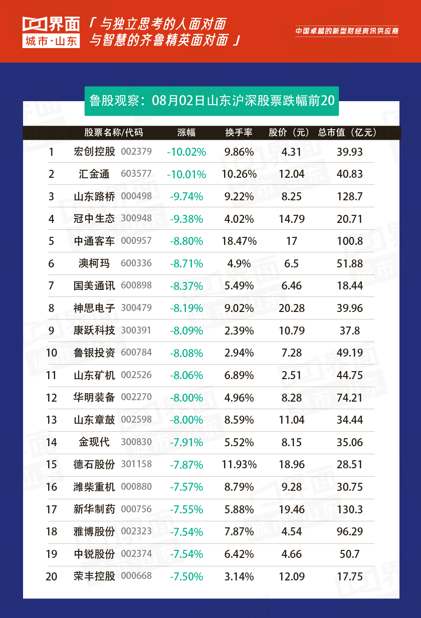 济南市跌幅榜首:山东路桥(000498),涨幅:-9.74%,股价8.25,总市值129亿元。