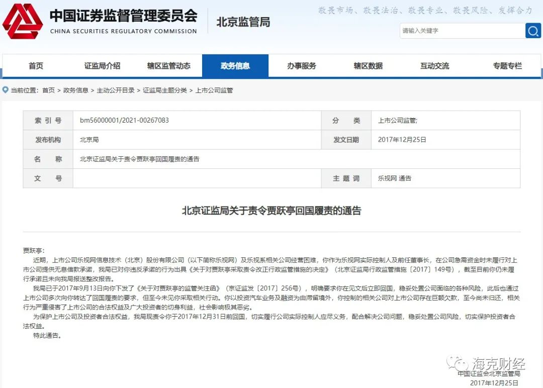 2017年12月11日,中国执行信息公开网消息,贾跃亭被北京市第三中级人民法院列入失信被执行人名单,成为“老赖”。北京市证监局责令他在同年12月31日前回国,履行乐视实控人应尽义务。贾跃亭对此置若罔闻,一再敷衍,迟迟没有付诸回国履责实际行动。