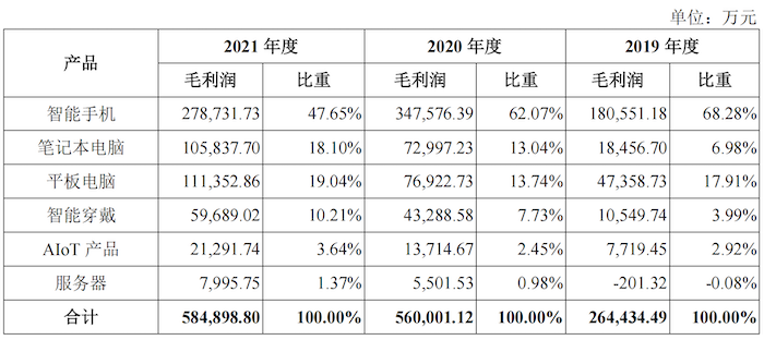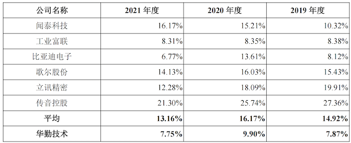 其一,公司2019年至2021年的综合毛利率分别为7.87%、9.90%和7.75%,相较于同行业可比公司闻泰科技、工业富联、比亚迪电子、歌尔股份、立讯精密、传音控股6家公司的平均水平14.92%、16.17%和13.16%来说,公司整体毛利率水平较薄,并不符合一家技术驱动企业的高毛利率特征。倘若剥离较高的专业服务收入毛利率后,公司产品销售的毛利率将进一步降低。