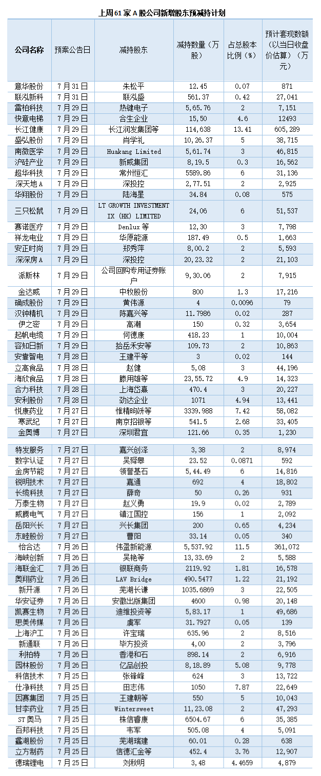上周(7月25日至7月31日),A股公司预减持规模有所增加。据界面新闻不完全统计,共有61家A股公司披露股东减持计划。