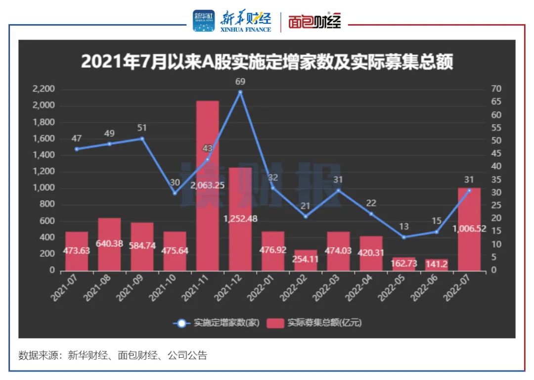 统计显示,2022年7月,A股上市公司共计实施定增31起,实际募资总额约1006.52亿元,定增实施家数及募集资金较上月均有明显上升,较上年同期相比,定增实施家数虽有下降,但实际募集资金增长明显。