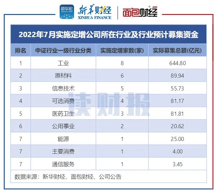 从行业分布来看,以中证行业统计,2022年7月,工业行业有8家上市公司实施定增,排在各行业之首;其次是原材料行业,有6家上市公司实施定增;信息技术行业有5家上市公司实施定增,排在第三位。