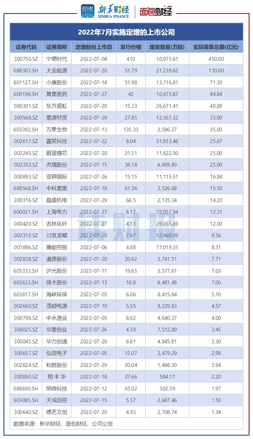 2022年7月实施定增的上市公司中,宁德时代的实际募资总额排在首位。宁德时代共发行约10975.61万股,发行价格为410元/股,实际募集资金总额约450亿元。发行对象包括南方东英资产管理有限公司、溧阳市先进储能私募基金合伙企业(有限合伙)、麦格理银行有限公司、香港上海汇丰银行有限公司等22家机构投资者。其募集资金将用于福鼎时代锂离子电池生产基地项目、广东瑞庆时代锂离子电池生产项目一期、江苏时代动力及储能锂离子电池研发与生产项目(四期)、宁德蕉城时代锂离子动力电池生产基地项目(车里湾项目)、以及宁德时代新能源先进技术研发与应用项目。