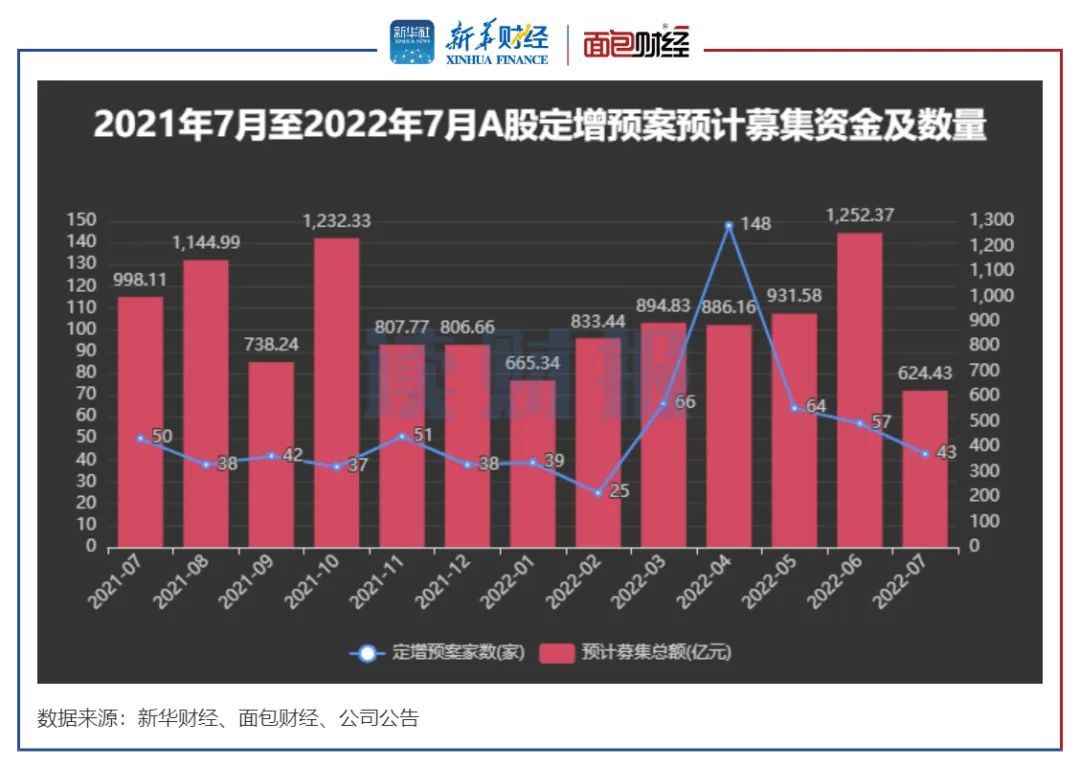 以首次披露预案公告日统计,2022年7月A股上市公司披露的定增预案(同一定增预案下的募资及配套募资合并统计,下同)共计43起,环比下降14起;预计募资规模合计约624.43亿元,与上月相比下降50.14%。