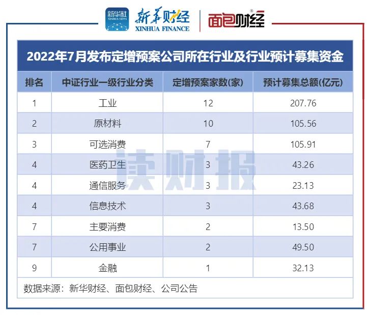 从行业分布来看,以中证行业统计,2022年7月,工业有12家公司发布定增预案,数量排在各行业之首;原材料行业排在第二位,有10家公司发布定增预案;可选消费行业有7家发布定增预案,位列第三位。医药卫生、通信服务和信息技术行业均有3家发布定增预案。